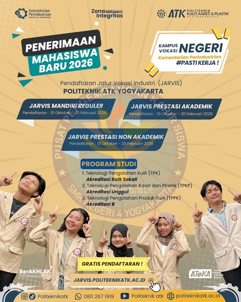 Sudah dibuka!! Pendaftaran Mahasiswa Baru Politeknik ATK Yogyakarta T.A 2026/2027Pendaftaran dibuka mulai 01 Oktober 2025 Laman pendaftaran: http://jarvis.politeknikatk.ac.id.Sebagai tambahan informasi, saat ini pendaftaran tidak dipungut biaya pendaftaran dan seleksi dilakukan secara ONLINE.Untuk informasi lebih lanjut bisa menghubungi:WhatsApp : 08112671919 (fast …