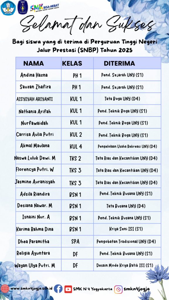 Keluarga besar SMK Negeri 4 Yogyakarta mengucapkan selamat kepada 17 siswa lolos SNBP Tahun 2025 “Semoga menjadi awal menuju kesuksesan”