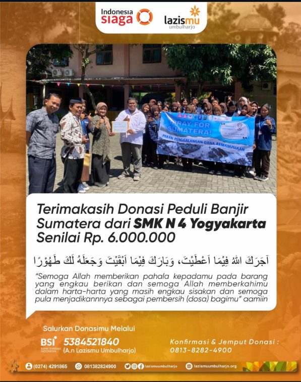 SMK Negeri 4 Yogyakarta melakukan kegiatan donasi peduli banjir yang sedang melanda saudara kita di Sumatera melalui Lazizmu Umbulharjo. Kegiatan ini didukung oleh seluruh siswa-siswi yang ada di SMK Negeri 4 Yogyakarta serta bapak/ibu guru dan karyawan. Donasi peduli banjir Sumatera dibuka sejak hari Senin, 8 Desember 2025 dan ditutup dihari Jumat, 12 Desember 2025 yang kemudian langsung diserahkan oleh Ibu Kepada Sekolah Nurlatifah Hidayati, M.Hum beserta perwakilan siswa siswi kepada Lazizmu Umbulharjo. Penyerahan donasi peduli banjir Sumatera dilakukan dihalaman SMK Negeri 4 Yogyakarta setelah pelaksanaan kegiatan classmetting yang dilakukan oleh siswa-siswi SMK Negeri 4 Yogyakarta. Kegiatan donasi peduli banjir Sumatera diharapkan mampu menumbuhkan rasa solidaritas dan kepedulian terhadap sesama serta bisa meringankan beban ekonomi bagi korban banjir, tentunya proses pemulihan pasca banjir Sumatera sangat membutuhkan uluran tangan kita. Donasi dilakukan oleh siswa dengan cara berkeliling di seluruh kelas-kelas dan kantor guru/karyawan, kemudian siswa-siswi menghitung hasil donasi dan diserahkan ke pihak Lazizmu Umbulharjo untuk disalurkan kepada saudara kita di Sumatera. Semoga saudara kita yang ada di Sumatera segera bisa pulih kembali.
